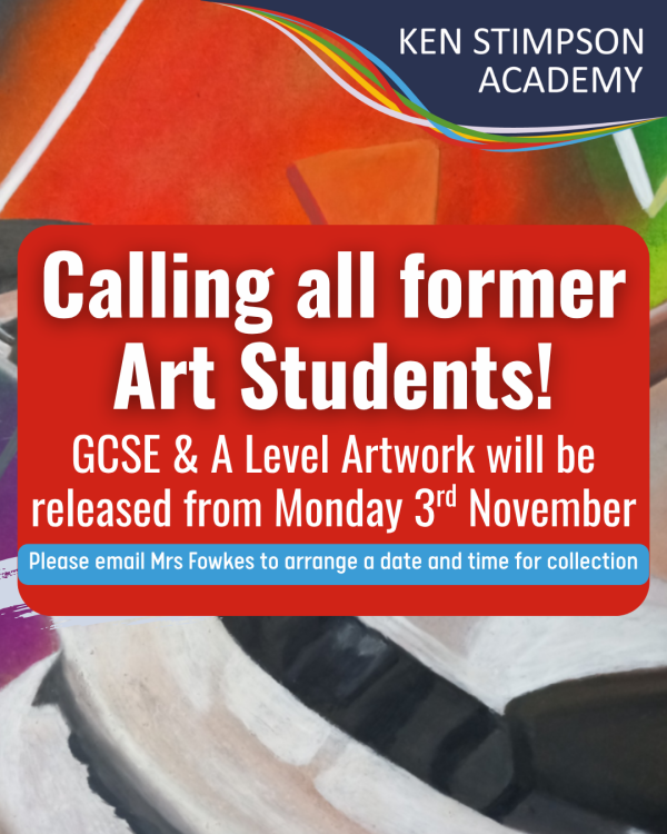 We will be releasing both the GCSE and A Level Artwork as soon as we return to school after half term (from November 3rd). To arrange a time to pick it up from the front office, please email Mrs K Fowkes and she will get back to you with a date and time.